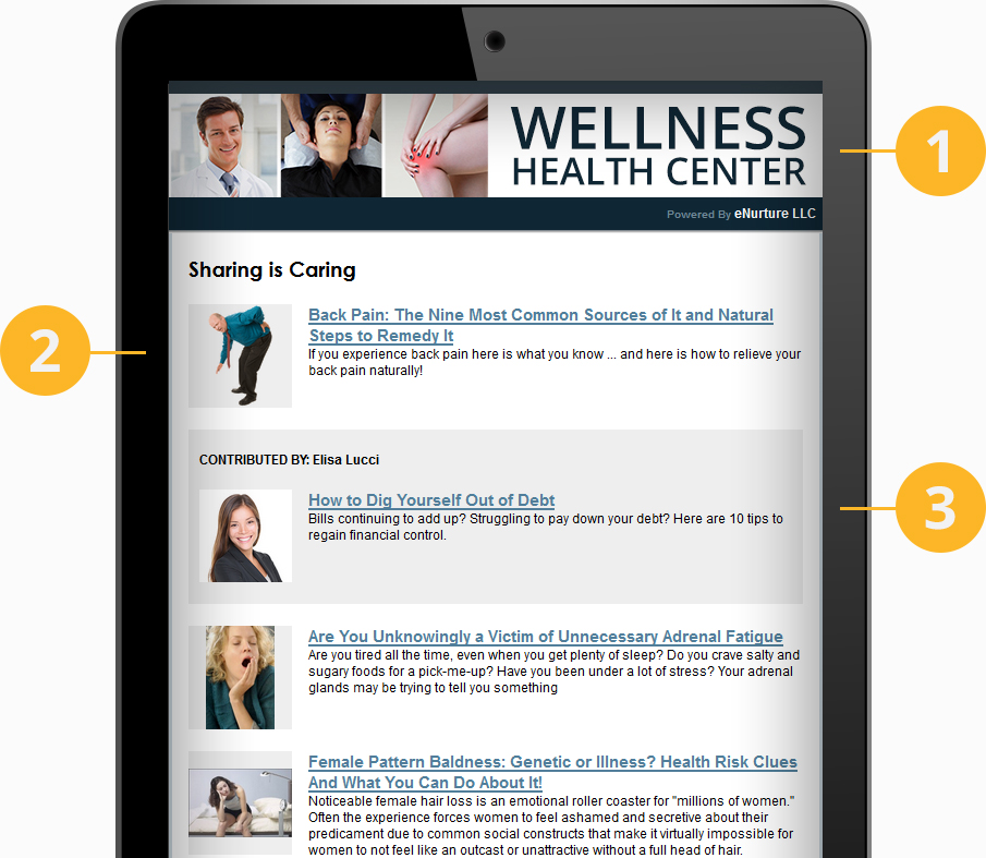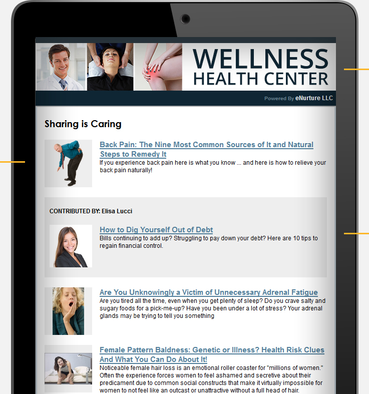 A preview is emailed to you (for review) one week prior to being emailed for you. In seconds opt-out of any article you don't like and/or add your own comments or promotions to any article. Patients will value and share these articles referring you in the process.