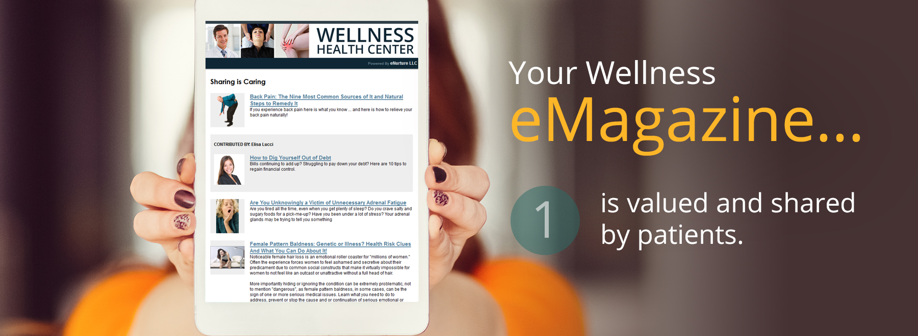 eNurture's Digital Wellness eMagazine makes Patient Referrals Easy! Educational and fun for patients to share articles referring new patients to you...